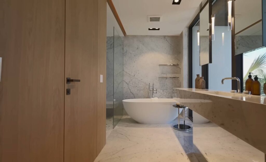 The bathrooms in her home have the modern theme with clean lines and spa-like features. It has rainfall showers, elegant fixtures, and natural light.